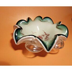 Vintage Murano Art Glass Bowl 7" x 7" Green, White, Clear