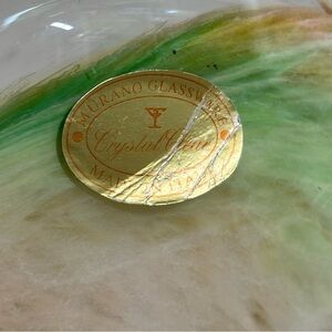 Vintage Murano pastel swirl pattern art glass bowl with fluted edges. Sticker states: Murano Glassware - Crystal Clear - Made in Italy. Gorgeous swirls of purple-pink, yellow-orange and blue-green make this a very desirable collectible piece. It is in excellent preowned condition with no chips, cracks or cloudiness on the surface.