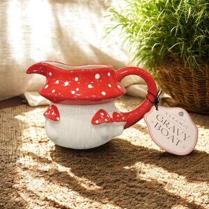Whimsical red and white mushroom-shaped ceramic gravy boat — a playful and functional piece for your kitchen or dining table.