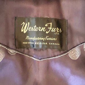 An absolutely beautiful cropped espresso brown muskrat fur coat. Made by Canadian Western Furs, this coat is such a stunning blend of dark brown tones in a striped pattern. It has large rounded collar (that you can "pop"), front slit pockets, 3/4 sleeves and closes by 2 black plastic buttons. The coat is lined in a chocolate brown printed satin lining.