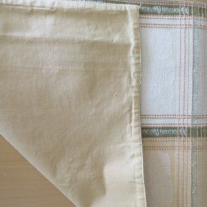 This vintage table runner has such an elegant design. The colours are mustard yellow and olive green with a burnt yellow stitching. The squares within the pattern feature pineapples and hibiscus flowers. The table runner is 100% cotton so machine washable.