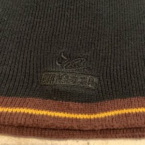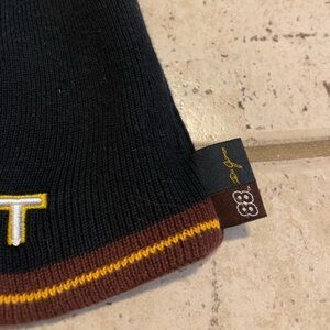 Get a piece of racing history with this vintage Dale Jarrett beanie! This black knit beanie features "JARRETT" embroidered on the front in white and yellow, along with a brown and yellow stripe detail around the brim. It's an authentic piece of NASCAR apparel, as indicated by the official Chase Authentics tag.