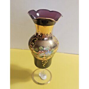 Vintage NASCO Japan Amethyst Glass Vase Raised Enamel Flowers 7"