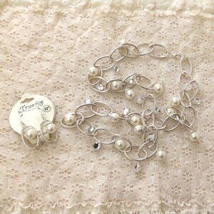 Vintage NEW True Handmade Pearl & Clear Glass Beads Silver Tone Necklace