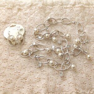 Vintage NEW True Handmade Pearl & Clear Glass Beads Silver Tone Necklace & Pearl Earrings Timeless VTG Art Deco Jewelry for Tops, Dresses, Sweaters