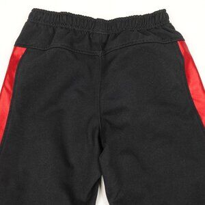 Nice thick materials, elastic and drawstring waist, ankle zippers. Great condition, deep black colour with shiny red satin accents, no stains, no rips or holes, very little wear. Tag size Large - see measurements in photos.