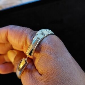 Cream enamel combined with clear rhinestones on a metal alloy forms this pretty bracelet. (All stones in place.) Pre-owned. Note. Invisible stretch from both sides of bracelet at seams. However, limited stretch. Best for smaller hand. Approx 2.5" diameter. Expands to approx 3" diameter. NRT Avon. Vintage.