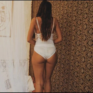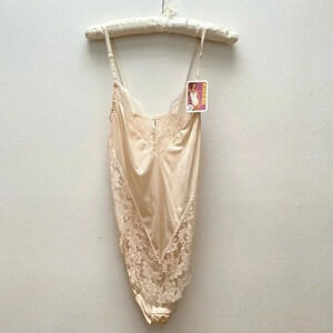 Side 34”, off-white Ivory colour, from the 90s; see contrast with white hanger. Adjustable straps and snaps. Only flaw is leftover residue from sticker on front as photographed. Not very noticeable and might come out in a wash. Sold as is.