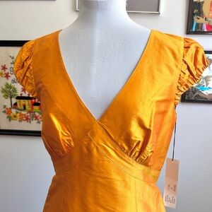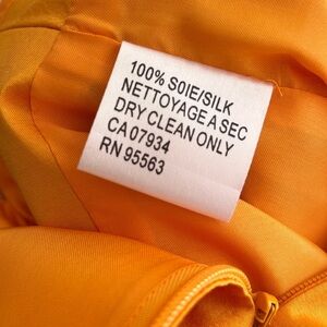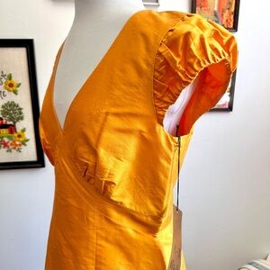 A striking vintage Simon Chang silk dress in a rich golden orange. Made of 100% silk, this piece has a luminous sheen that catches the light beautifully. The dress features a deep V-neckline, empire waist seaming, and softly ruched cap sleeves. Tailored to flatter, it skims the body with a structured fit and closes with a back zipper.