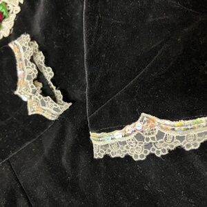 Vintage Nadia Papini black velvet with peek a boo sequin neck window. High collar. Lace and sequin trim throughout all in tact. Excellent mint condition.