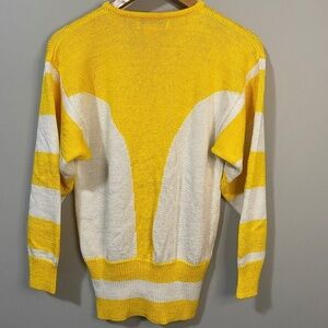 Keywords: vintage cardigan, Nannell sweater, yellow white cardigan, nautical button sweater, retro knitwear, color block cardigan, gold button sweater, anchor button, vintage style, womens cardigan, size medium, 80s fashion, preppy style