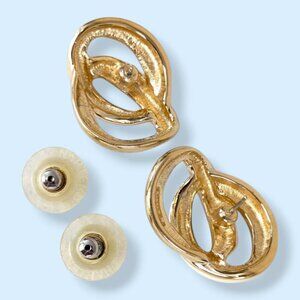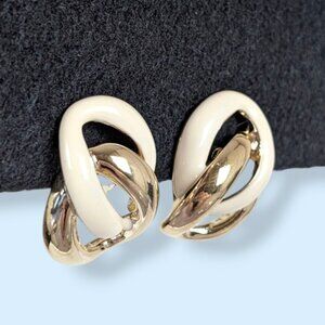 These vintage earrings by Napier are made of a gold tone metal and have simple post findings. The earrings are each shaped like two linked rings: the top ring is white enamel, and the bottom ring is gold tone. The earrings are stamped Napier on the back sides, as well as on the backings. There is normal wear throughout, but the earrings are still very wearable.