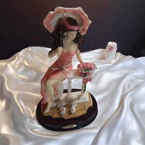 Bring timeless elegance to your home with this Vintage Natelia Collection Lady with Umbrella Figurine. 🌸 This exquisite resin piece features a graceful lady in a flowing salmon pink dress, seated on a bench with a matching umbrella. Two charming doves rest at her feet, and delicate flowers add a touch of whimsy. Measuring 10" H x 6" W, it’s the perfect size for a shelf, mantel, or tabletop display. Expertly crafted with fine detailing, this figurine is in very good vintage condition—no chips or cracks, with only minor marks on the wood base. A romantic, collectible decorative accent ideal for vintage décor lovers, cottagecore enthusiasts, or as a thoughtful gift.