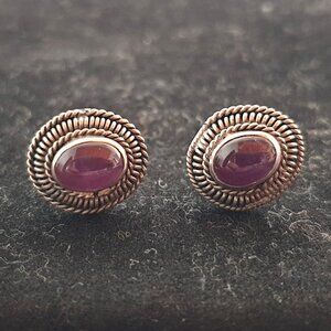 Beautiful handcrafted vintage stud earrings featuring genuine natural amethyst cabochons set in twisted 925 sterling silver rope frames.