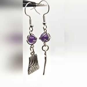 Vintage Natural Amethyst Sphere Wire Wrap Cage Dangle Earrings Silver