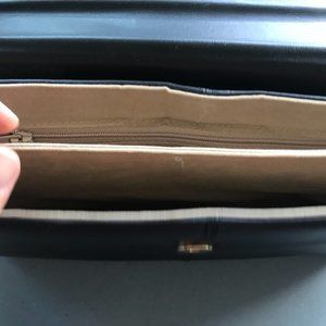 This clutch bag is in like-new, mint condition and honestly looks barely used. The material may be leather; it's soft and buttery to the touch but there's no material tag on the inside so I am not entirely sure. The inside of the purse and the zippered pocket are very clean and lined with lined with a suede-like beige material. Snap Closure with tight grip. Size: Length: 11", Width 6.75", Thickness: 1.5"