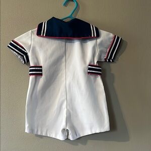 Charming vintage white sailor romper with navy and red accents. Features a nautical emblem and gold buttons.