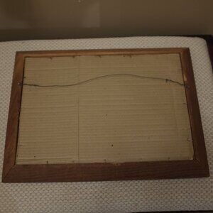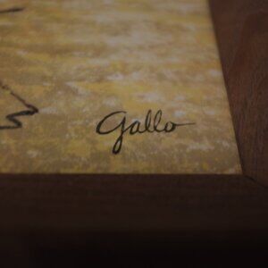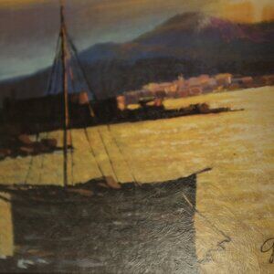 This charming framed artwork features a serene coastal scene at sunset. The painting depicts a small sailboat in the foreground, anchored in golden waters reflecting the warm hues of the setting sun. In the background, mountains and a shoreline create a picturesque landscape. The piece is signed by the artist Gallo and encased in a rustic wooden frame. Approximately the size of a serving tray, this artwork would add a touch of maritime charm to any room. Perfect for coastal-themed decor or as a standalone statement piece.