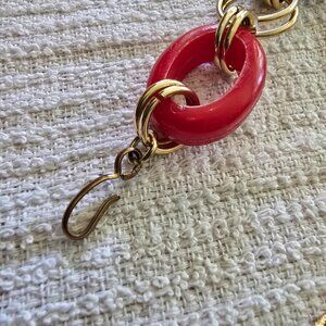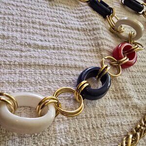 Red, white & blue plastic links interspersed with the gold links.