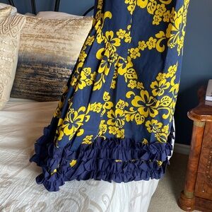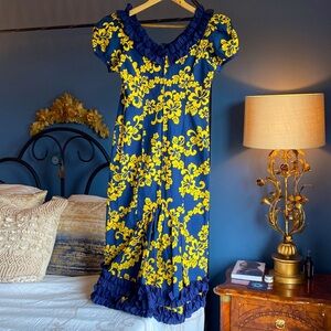 Vintage navy blue with yellow floral hibiscus print and navy blue ruffles at neckline and skirt traditional Hawaiian dress, size S. Made in Hawaii by Muu Muu Apparel. 50% cotton, 50% polyester. Excellent vintage condition, cat friendly, nonsmoking home.