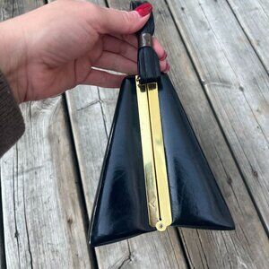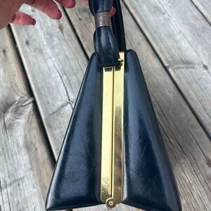 Vintage Navy Box Handbag Gold Hardware Top Handle 50s 60s Classic Chic