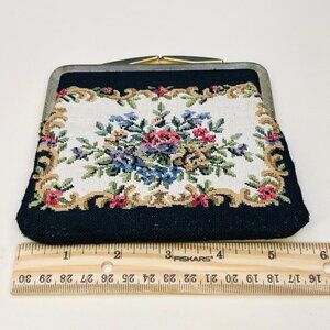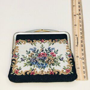 Vintage 60s Needlepoint Floral Dark Tapestry Clutch Coin Purse