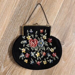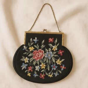 Vintage Needlepoint Tapestry Floral Purse with Clasp Closure & Chain Handle