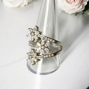 A stunning Vintage Nevada Sterling Plated Clear Crystal Rhinestone Flower Ring. Crafted with intricate floral details and sparkling rhinestones featuring a silver-tone metal band that spirals around the finger. It is adorned with three floral designs, each composed of clear, marquise-cut stones and a round center stone. Additional small, clear stones are set along the band. The ring appears to be approximately size 11 but can be pressed together to make smaller. There is NV markings. Minor wear is present with some copper showing on the edges due to its pre-owned status.