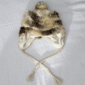 Features ear covers and Braided sides to tie or leave as is. Double lining with interior fleece lining. Partial knit design with faux fur trimings.
