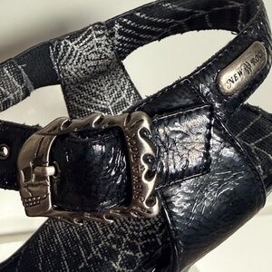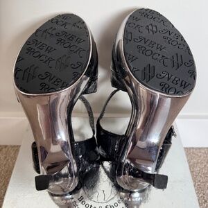 Vintage New Rock black patent leather platform stilettos. Skull buckle detail. Comes in original box with set of heel replacement tips. Although the shoes were only worn once, there is a bit of wear at the heel (as per the photos).