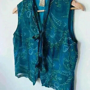 Vintage New York City Design Co Paisley Green Button Up Sleeveless Blouse Silk Medium