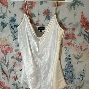 Chic white camisole with a shimmering finish. Features a stylish cowl neck and delicate rhinestone straps. Perfect for elegant occasions.