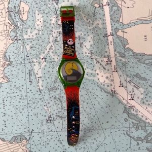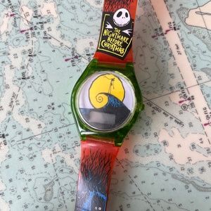 Vintage 90s Nightmare Before Christmas watch. Plastic swatch style with printed band, shows light signs of wear, unsure if working. Measures 9" long, 1.5" wide.