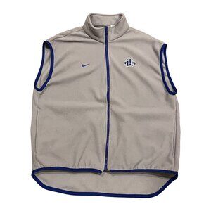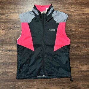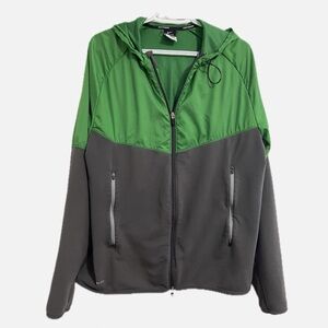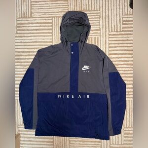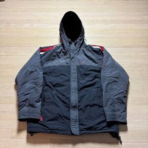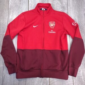 Sleek black jacket featuring a bold red Nike logo. Classic design with subtle white trim.