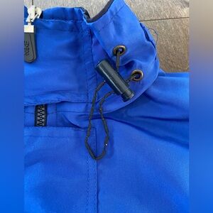 Stay stylish and comfortable with the Nike Men's Blue and Black Jacket. Perfect for any casual outing. Hood rucks into zipper pack at top, can be removed. -drawstrings are damaged from age, stretch waist band at bottom. Mesh/windbreaker . Sleeves zip off. For like a large.