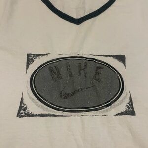 Step back in time with this classic vintage Nike ringer t-shirt! This comfortable tee features a crisp white body with a contrasting black trim on the V-neck collar, giving it that iconic retro look. The front showcases an oval graphic with the "NIKE" logo. Perfect for a casual, sporty, or streetwear vibe.