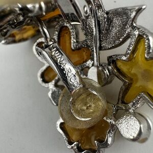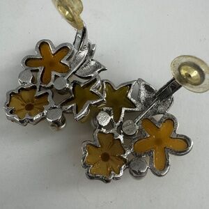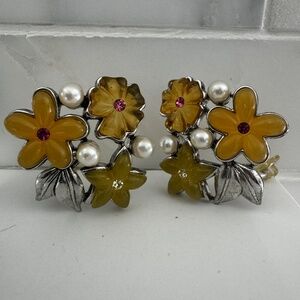 Vintage Nina Ricci Earrings Clip On Flowers Silver Tone 80's with the original price tag , faux pearls , rhinestones and lucite flowers.