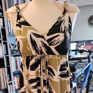 This Nine West dress was purchased just after 2000, and has been very very gently worn, like once to a wedding. It is in like new condition and is a great piece to any collection. The dress is a maxi and has a "crossover" style bodice. The material is very flowy and hangs very well, as it is a heavier polyester spandex blend. The shoulder straps are twisted, and it has an elastic waist, with a long spaghetti sash that can be wrapped around or tied and left long. This is an AMAZING dress for travelling, because it doesn't wrinkle, and it holds its' shape all day long from brunch to evening.