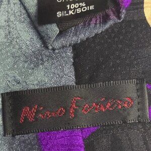 Add a bold retro touch to your wardrobe with this authentic Nino Foriero men’s necktie. Made of 100% silk, this tie showcases a striking abstract geometric pattern in shades of purple, black, gray, and gold — a design style that defined the late 1980s and early 1990s fashion era. Nino Foriero ties were often crafted in Italy and Canada, catering to men who wanted unique designs beyond the mainstream luxury labels. While not a global designer powerhouse, the brand earned a following among those who appreciated quality fabrics and expressive, eye-catching styles.