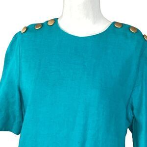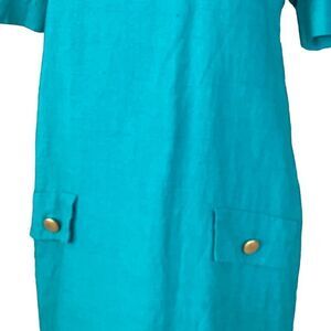 Blue turquoise, heavyweight linen, lined, 23” back zipper, mid calf length, gold tone button detail on shoulder and pockets, short sleeve, round neck, two front faux pockets with gold tone buttons, EUC, neck to hem 40”, armpit to armpit 20”, waist 20”