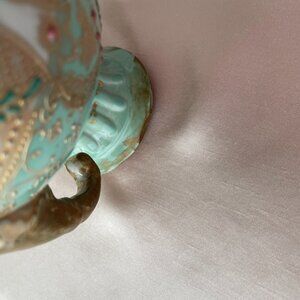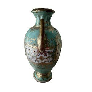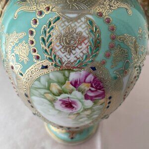 This beautifully hand painted vase is a pale green with pink roses and gold adornment. Gold handles.