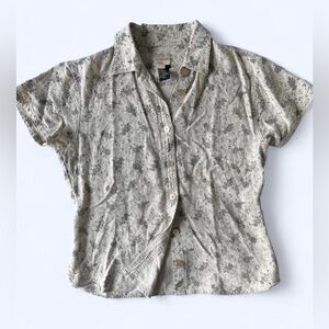 Vintage No-Excess Womens Floral Cottagecore Grey Linen Blend Short Sleeve Button Up Shirt Large