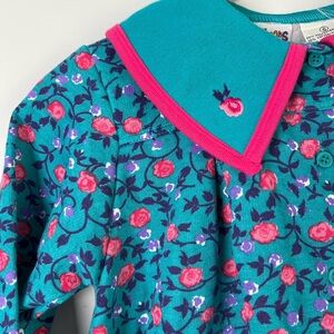 Vintage Noah’s Ark long sleeve. This is like a really light sweater material - so soft and cozy. Vibrant blue with pink trim and an all over floral pattern. Collar with floral detailing. Deadstock - new with tags.