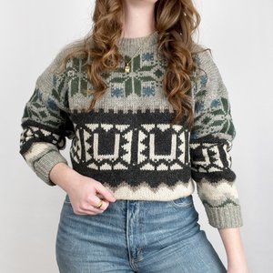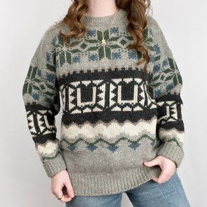 Vintage Nordic Fair Isle Ski Sweater Knit 100% Wool Slouchy Oversized Grandpa