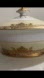 The pattern is of gold flowers and scrolling vines on a cream/yellow coloured band on bowl and lid with the same gold gilding on the handles.