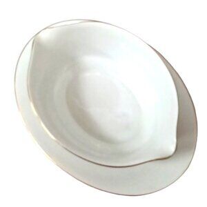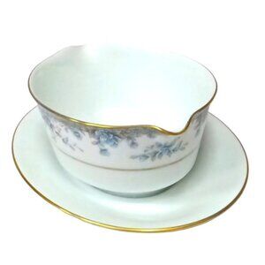 Add elegance and style to your dining table with this Noritake Avalon '3390' Gravy Boat with Attached Tray. Made in the Philippines between 1983 and 1990, the contemporary design, with gold trim detailing, showcases the beauty of porcelain and adds a touch of sophistication to any table setting. Crafted by Noritake, a trusted brand in fine china, this white with blue florals and gold trim gravy boat is a perfect addition to your collection. With its printed backstamp, you can be assured of its authenticity. Whether it’s a special occasion or a family dinner, this gravy boat is sure to impress.