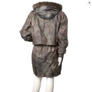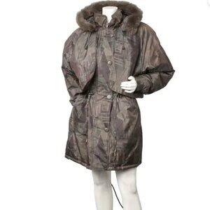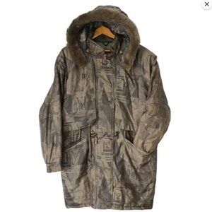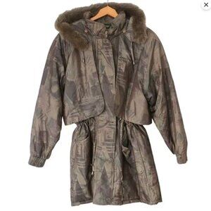 Vintage Northern Climate Parka Winter Coat Camo Olive Green Brown Faux Fur Hood