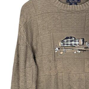 Channel classic 90s vibes with this vintage *Northern Golf Elements* sweater in a muted tan hue and subtle grid knit pattern 🏌️♂️. Featuring embroidered golf clubs and gear with plaid accents, this soft cotton grandpa-style pullover is perfect for vintage lovers, golfers, and cozy-core fashion fans alike!