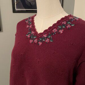 Details: Cozy and timeless Northern Reflections knit sweater in a rich burgundy red. Features beautiful floral embroidery around the scalloped V-neckline with pink, green, and blue accents.