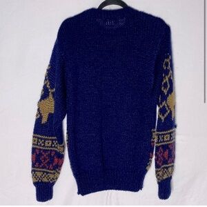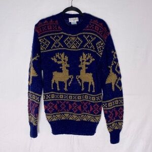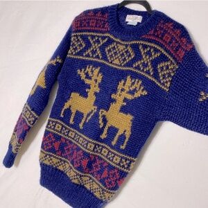 Vintage Northern Spirit Hand Knit Jacquard Deer Print Crew Neck Sweater S